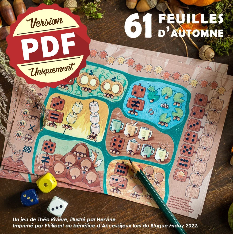 61 Feuilles d’Automne est un jeu proposé lors du Blague Friday 2022 par Philibert, avec des bénéfices reversés à l’association AccessiJeux. Les joueurs lancent trois dés à chaque tour et utilisent les résultats pour remplir différentes zones de leur fiche, représentant des activités automnales telles que griller des chamallows ou observer des grenouilles. Chaque zone a ses propres règles de placement et offre des points de victoire en fonction de la manière dont elle est complétée.